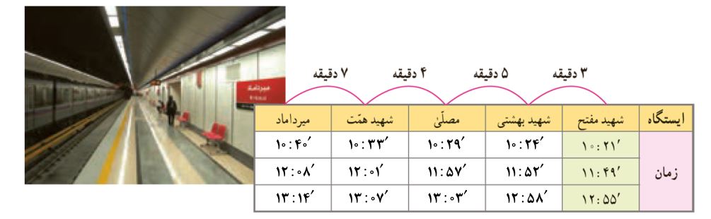 سوال 1: در جدول زیر، زمان رسیدن قطار به ایستگاههای متروی شهر تهران را میبینید. زمان شروع حرکت هر قطار، در جدول زیر نوشته شده است. زمان رسیدن آنها به هر ایستگاه را مشخص کنید.
