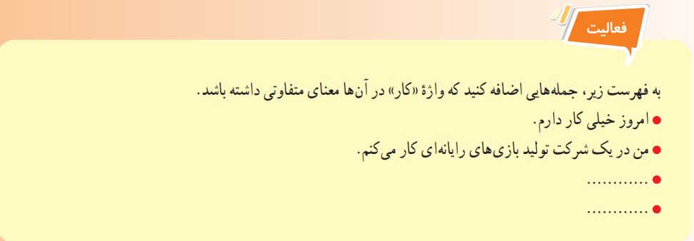 پرسش: به فهرست زیر، جملههایی اضافه کنید که واژه «کار» در آنها معنای متفاوتی داشته باشد.