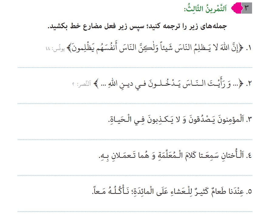 سوال: جملههای زير را ترجمه کنيد؛ سپس زير فعل مضارع خط بکشيد.