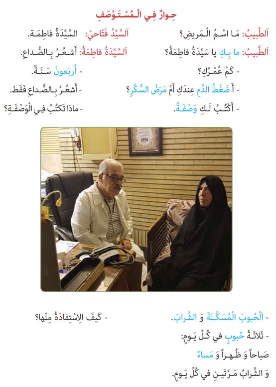 اَلطَّبیبُ :مَا اسْمُ الْمَریضِ؟ اَلسَّیِّدُ فَتّاحيّ :السَّیِّدَةُ فاطِمَة.