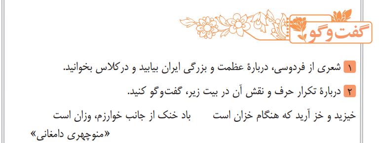 سوال 1: شعری از فردوسی، درباره عظمت و بزرگی ایران بیابید و در کلاس بخوانید.