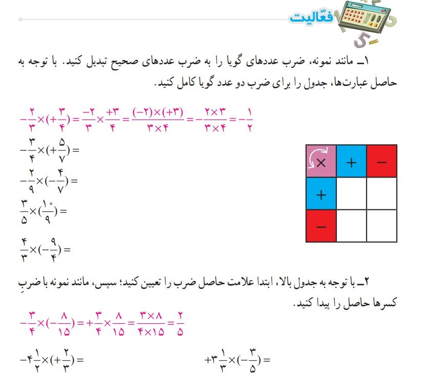 سوال 1: مانند نمونه، ضرب عددهای گویا را به ضرب عددهای صحیح تبدیک کنید. با توجه به حاصل عبارتها، جدول را برای ضرب دو عدد گویا کامل کنید.