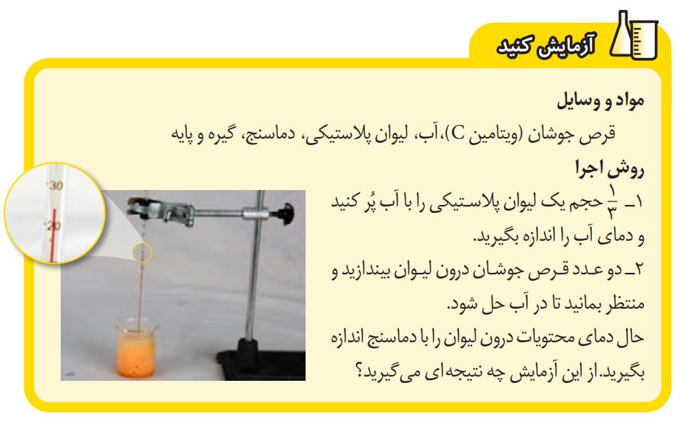 قرص جوشان (ویتامین C)، آب، لیوان پلاستیکی، دماسنج، گیره و پایه