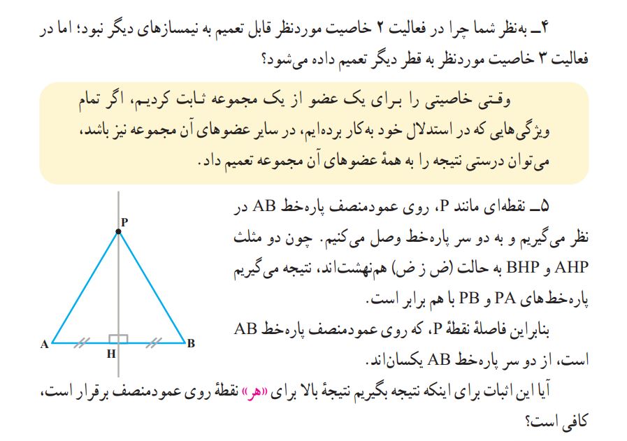 ادامه سوال 5: آیا این اثبات برای اینکه نتیجه بگیریم نتیجه بالا برای «هر» نقطه روی عمود منصف برقرار است. کافی است؟