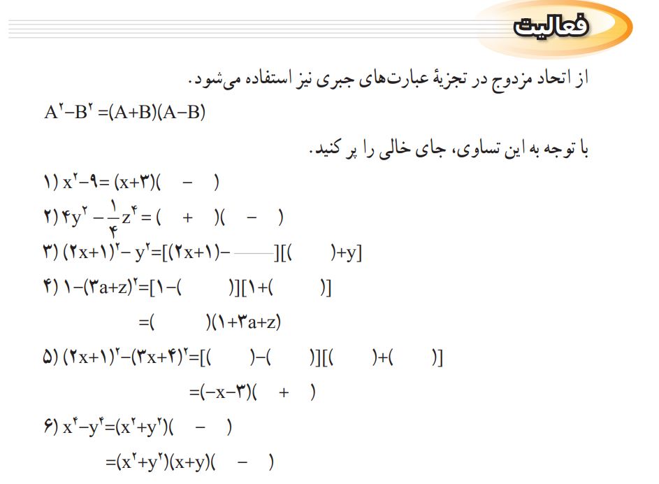 سوال : از اتحاد مزدوج در تجزیه عبارتهای جبری نیز استفاده میشود.