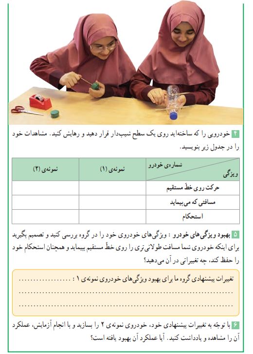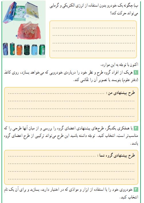 پرسش 1) هریک از افراد گروه طرح و نظر خود را دربارهی خودرویی که میخواهد بسازد، روی کاغذّ (دفتر علوم) بنویسد یا تصویر آن را نقاشی کند.