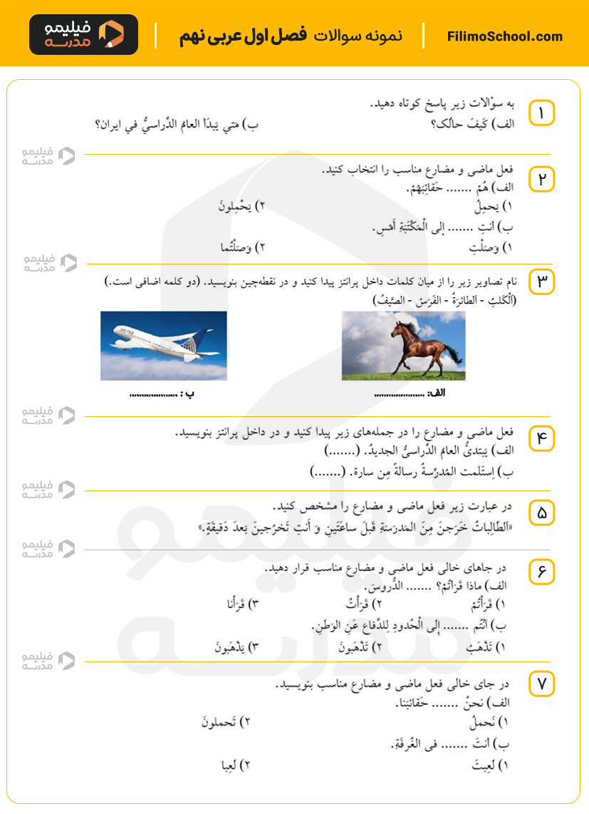 دانلود نمونه سوالات درس اول عربی نهم با جواب