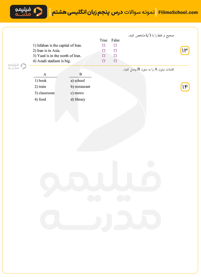 این فایل pdf شامل 14 سوال امتحانی از درس پنجم زبان انگلیسی هشتم است.