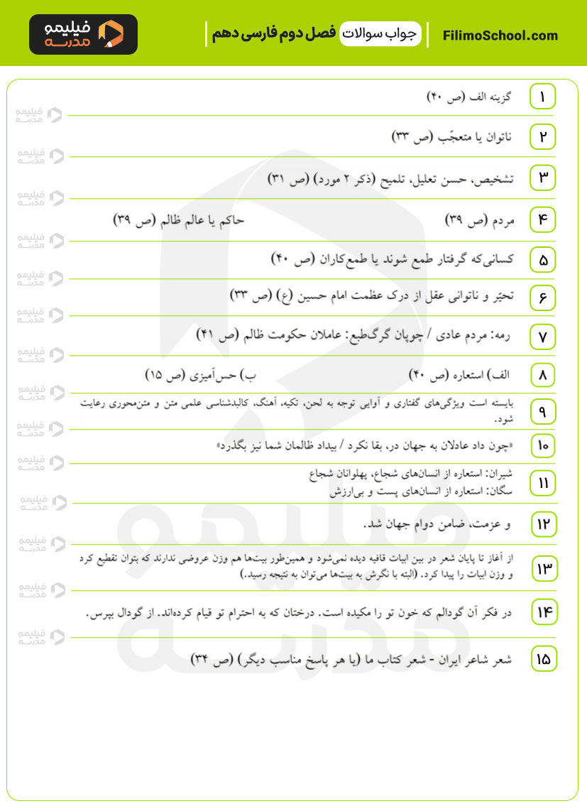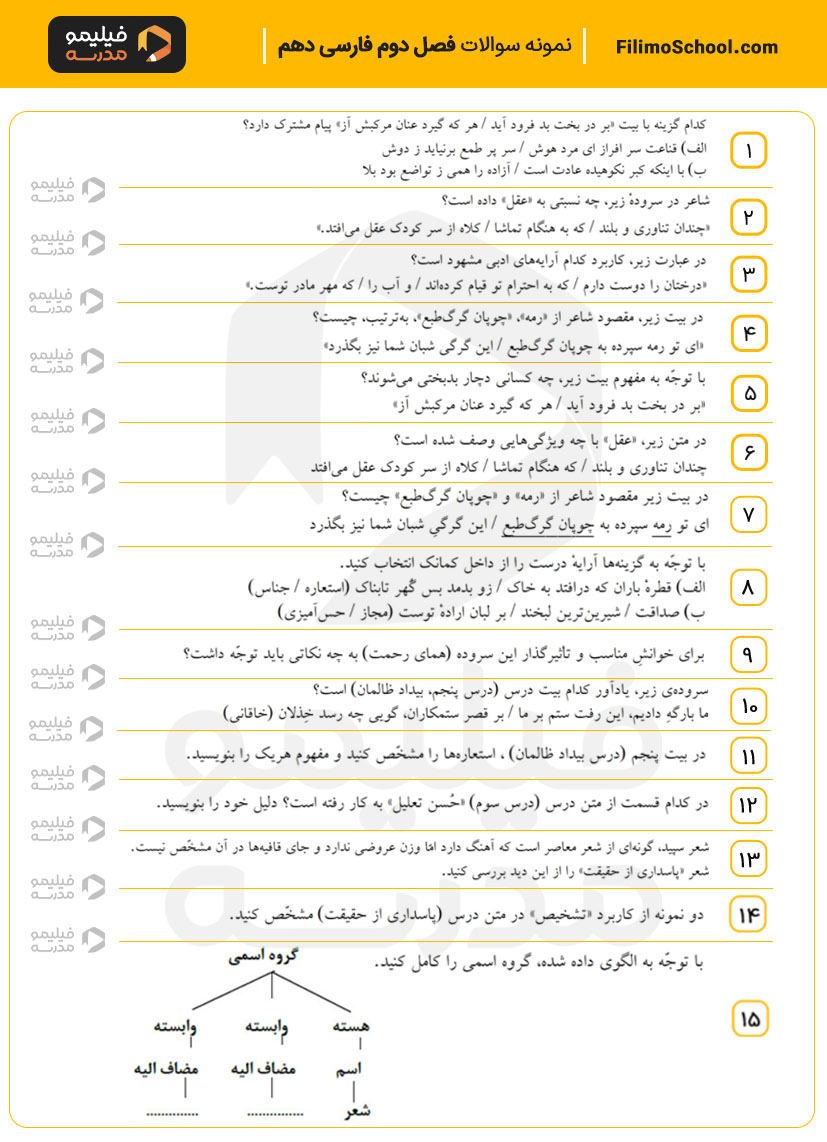 این فایل pdf شامل 15 سوال امتحانی از فصل دوم فارسی دهم است.