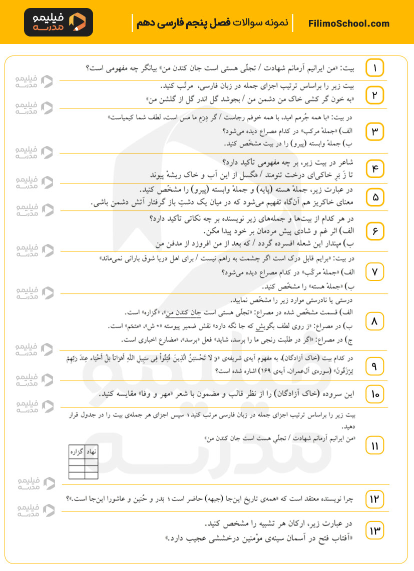 نمونه سوالات فصل پنجم فارسی دهم