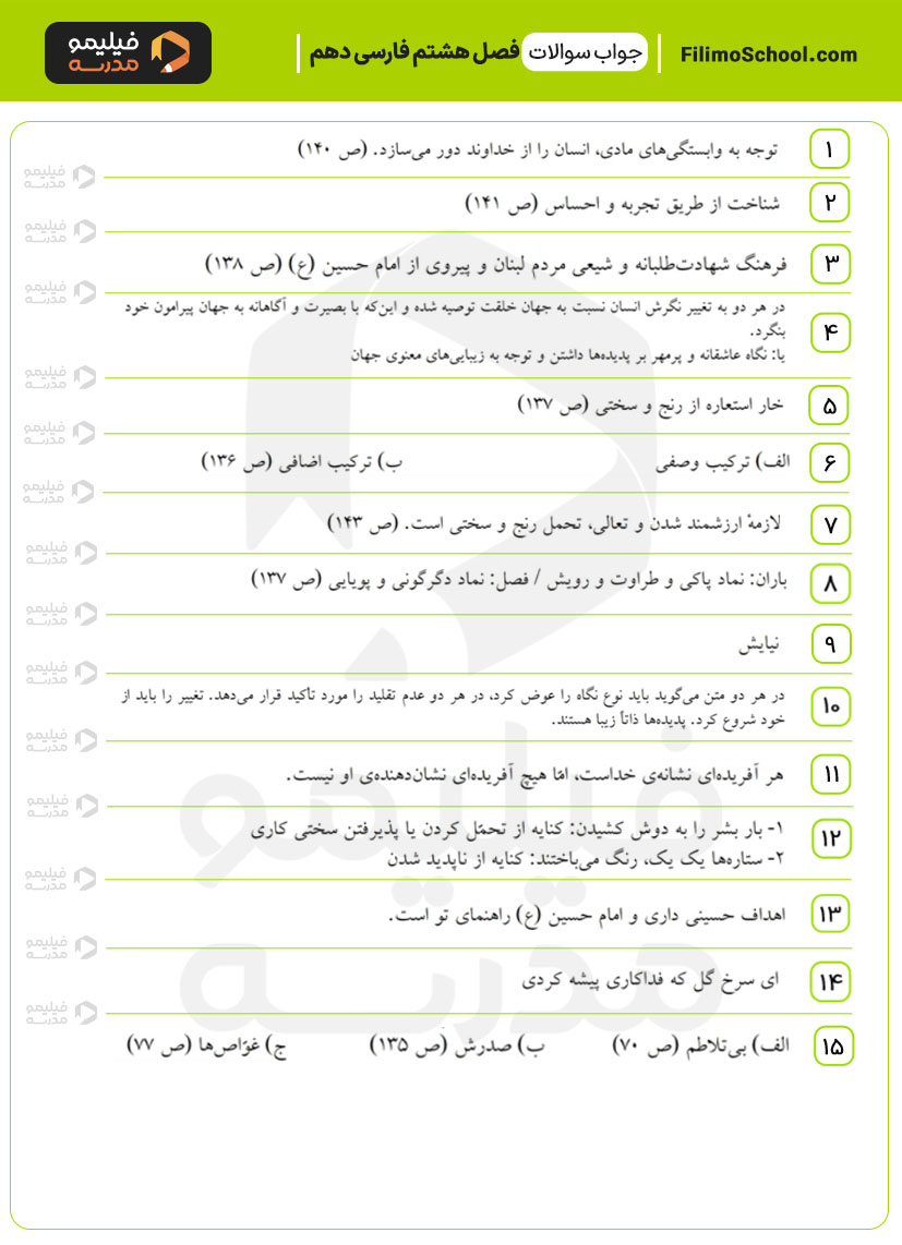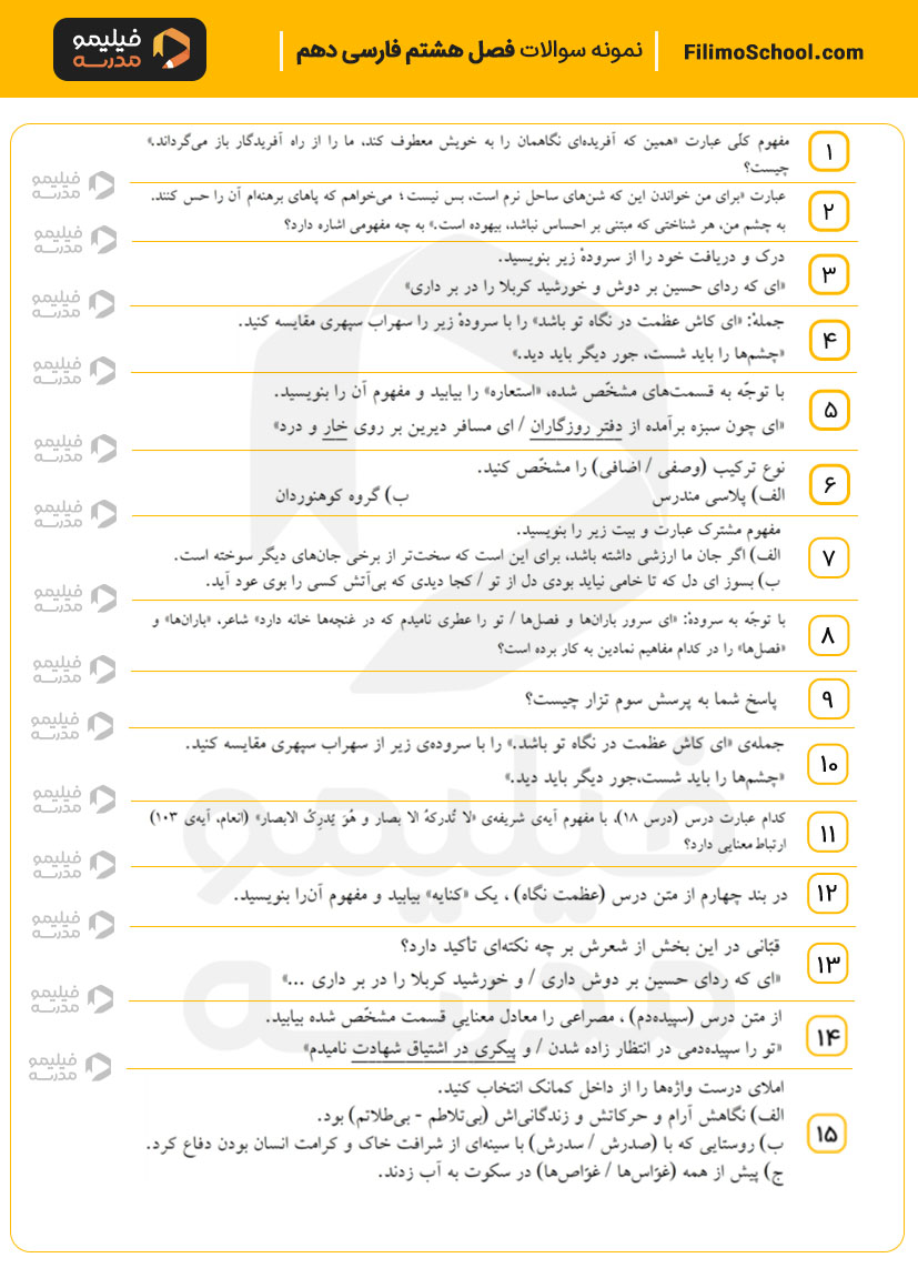 این فایل pdf شامل 15 سوال امتحانی از فصل هشتم فارسی دهم است.