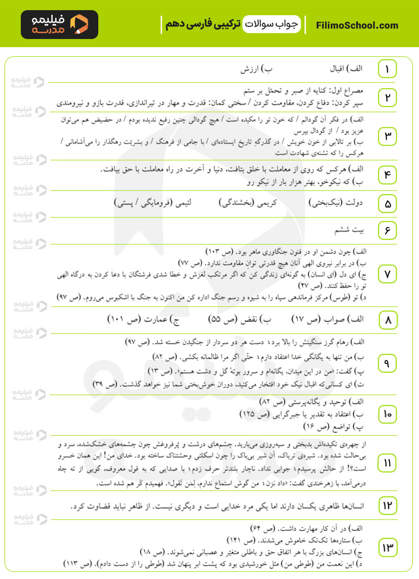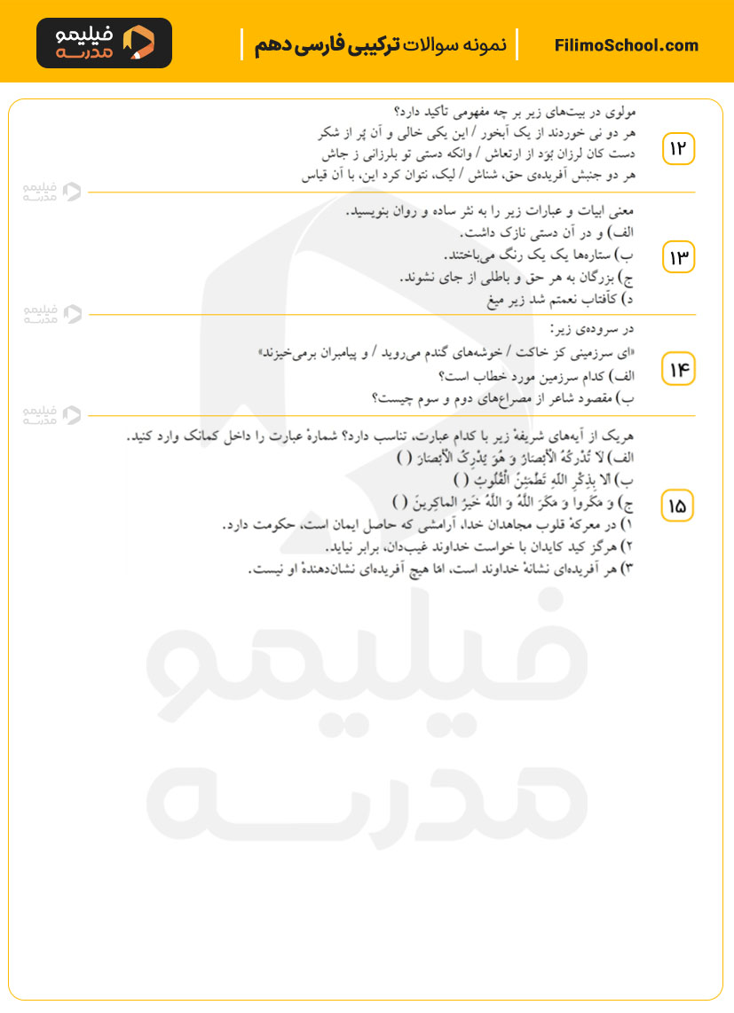 این فایل pdf شامل 15 سوال امتحانی ترکیبی از دروس فارسی دهم است.