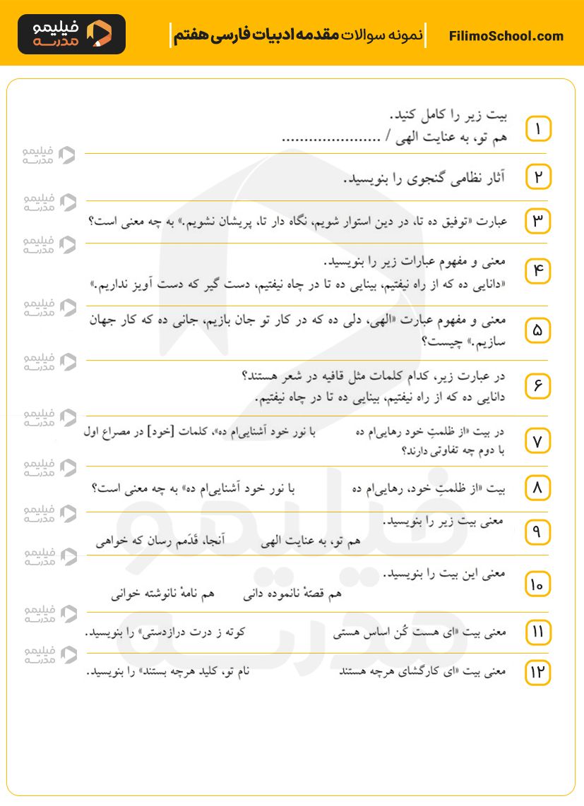 این فایل pdf شامل 12 سوال امتحانی مقدمه ادبیات فارسی هفتم است.