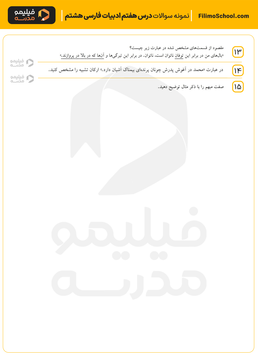 این فایل pdf شامل 15 سوال امتحانی از درس هفتم ادبیات فارسی هشتم است.