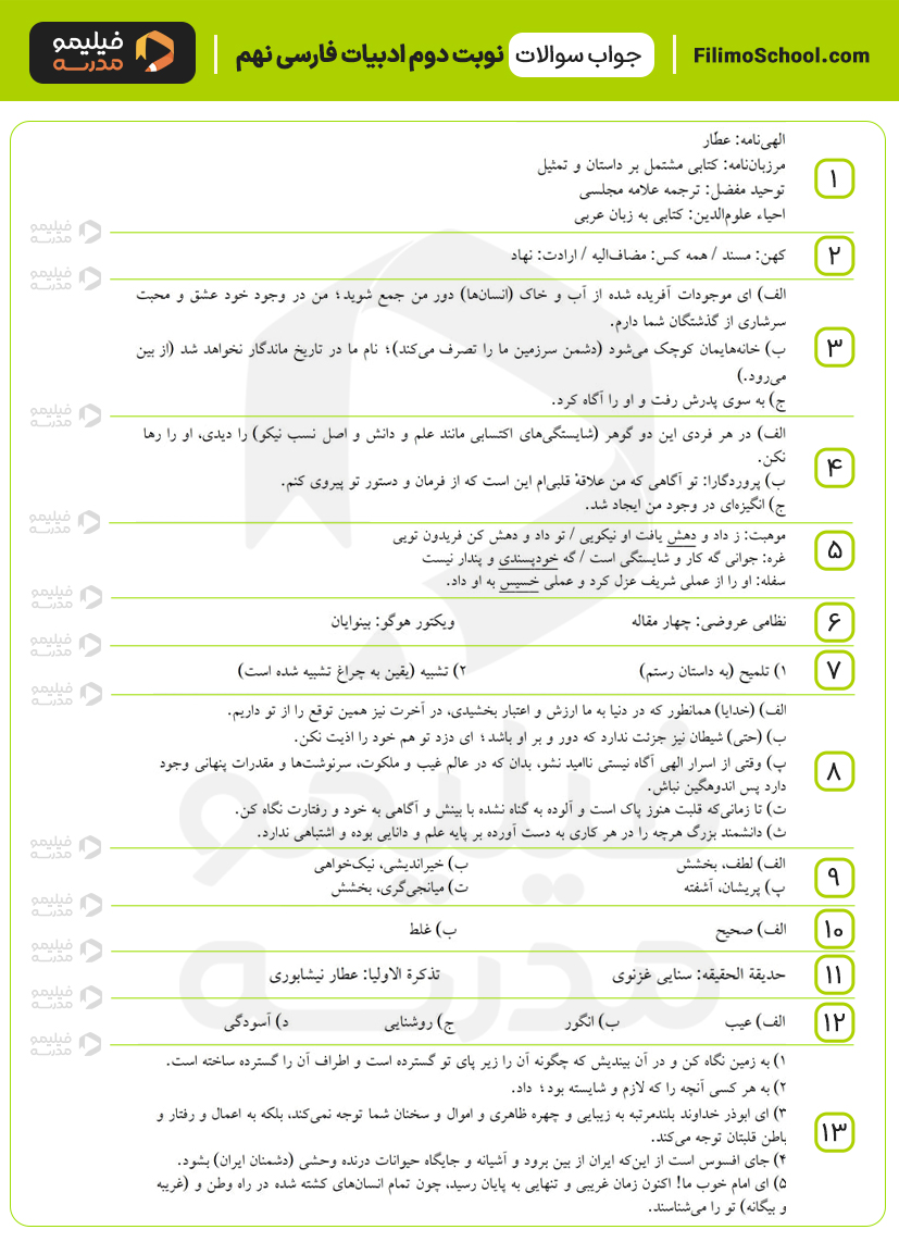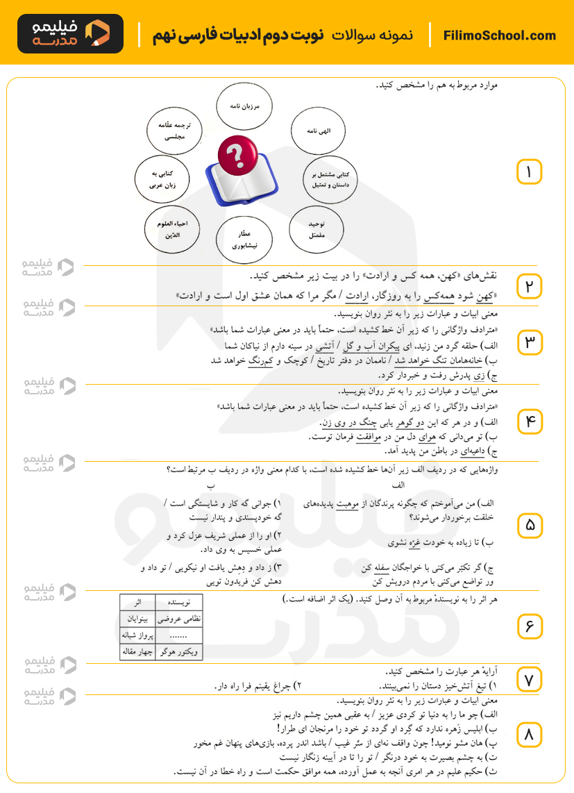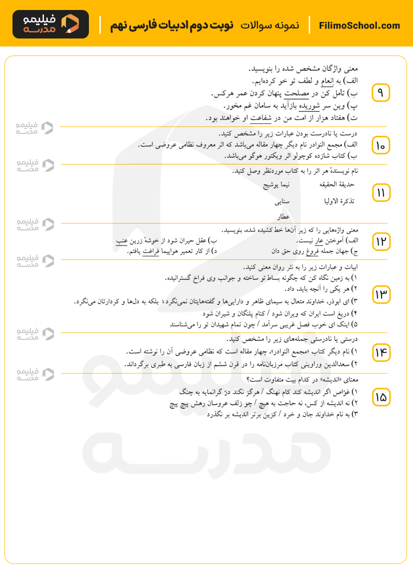 این فایل pdf شامل 15 سوال امتحانی نوبت دوم فارسی نهم است.
