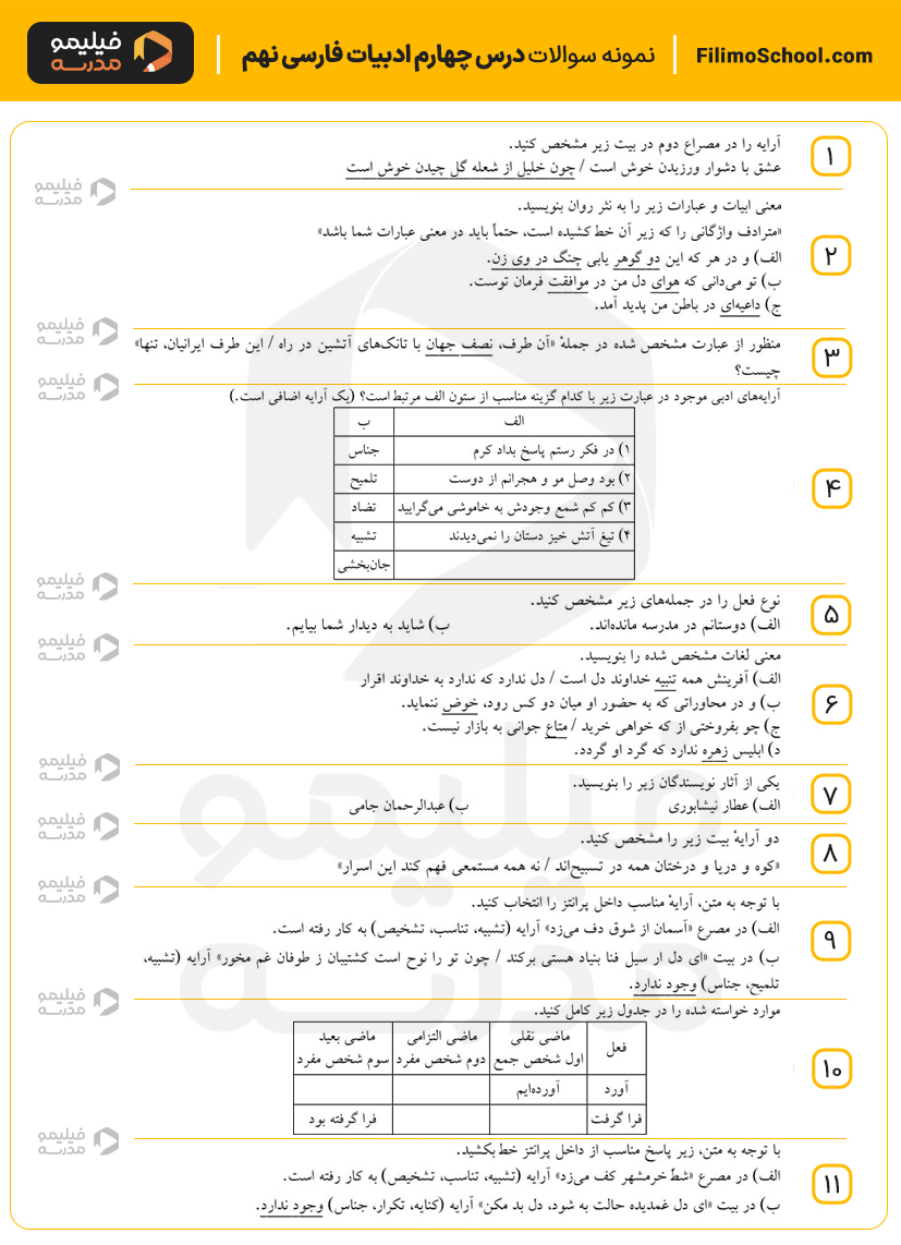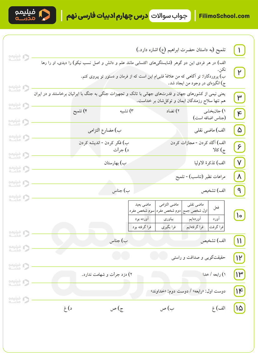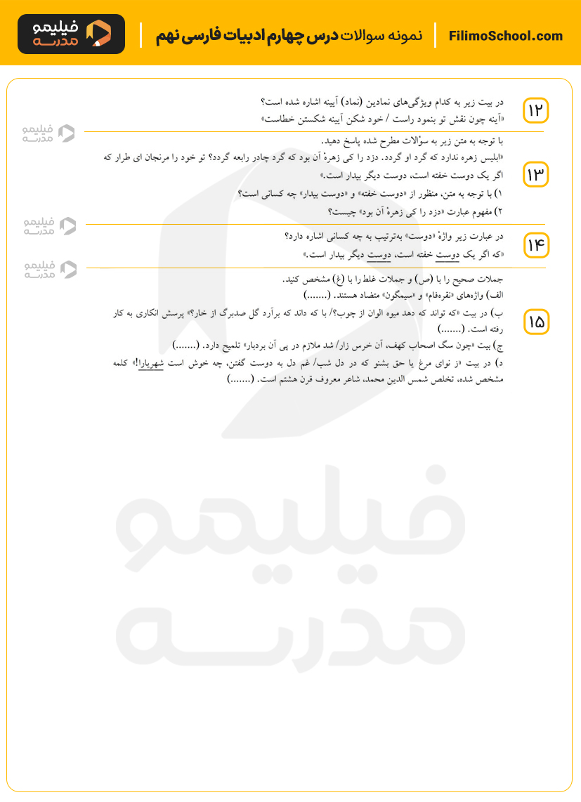 این فایل pdf شامل 15 سوال امتحانی درس چهارم ادبیات فارسی نهم است.