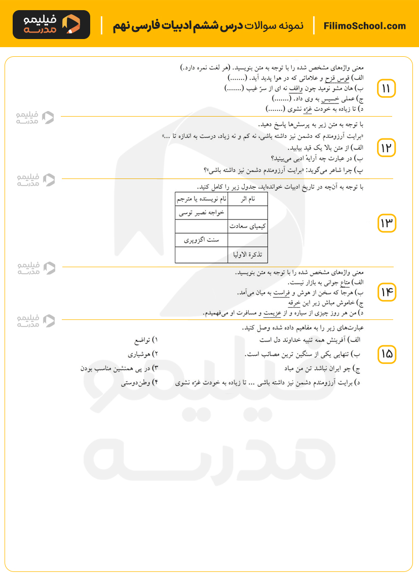این فایل pdf شامل 15 سوال امتحانی درس ششم ادبیات فارسی نهم است.