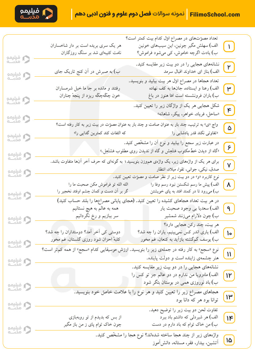 این فایل pdf شامل 15 سوال امتحانی از فصل دوم علوم و فنون ادبی دهم است.