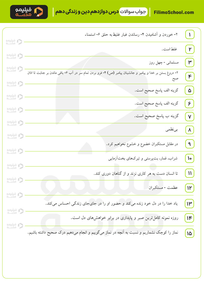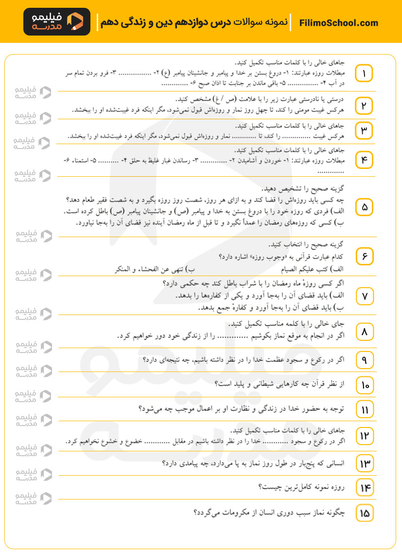 این فایل pdf شامل 15 سوال امتحانی از درس دوازدهم دین و زندگی دهم است.