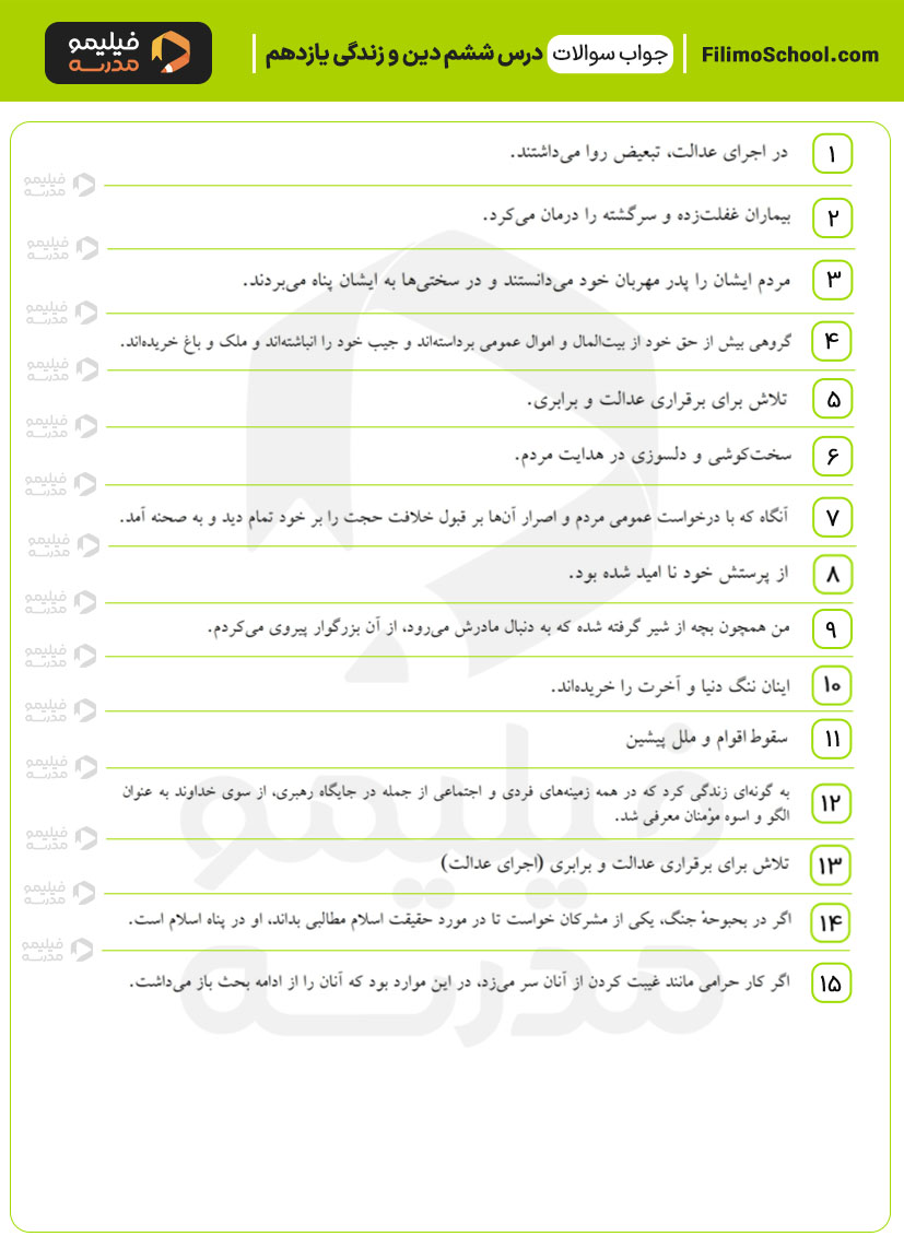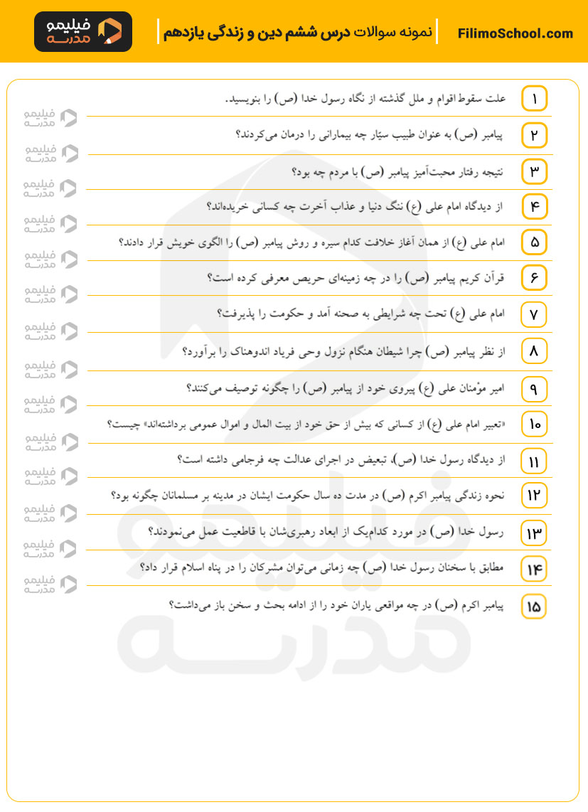 این فایل pdf شامل 15 سوال امتحانی از درس ششم دین و زندگی یازدهم است.