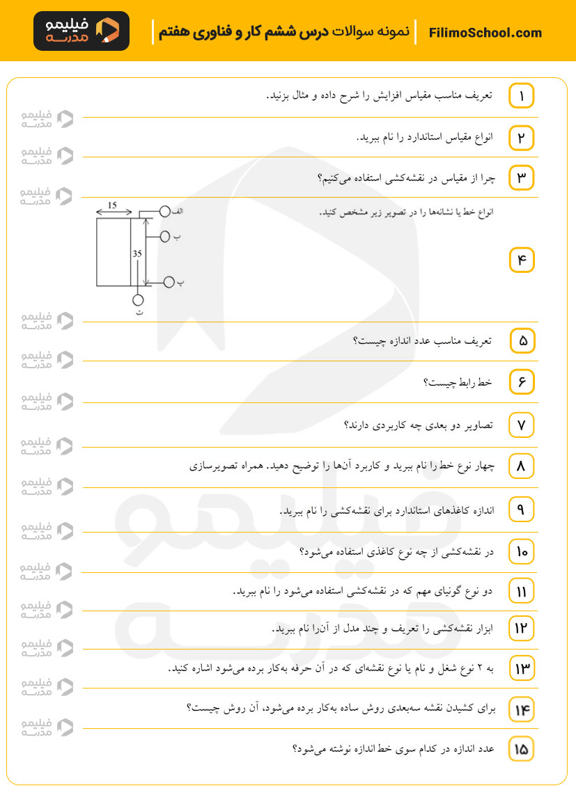 این فایل pdf شامل 15 سوال امتحانی از درس ششم کار و فناوری هفتم است.