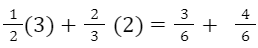 اکنون باید این کسرها را با هم جمع کنیم. بنابراین باید مخرج مشترک دو کسر را گرفته و این کسرها را یکسان کنیم تا عمل جمع کردن آسانتر شود. برای این کار ابتدا باید کوچکترین مضرب مشترک بین 2 و 3 را بدست آوریم که عدد 6 است. سپس کافیست کسر 1/2 را در 3 و کسر 2/3 را در 2 ضرب کنیم. پس: